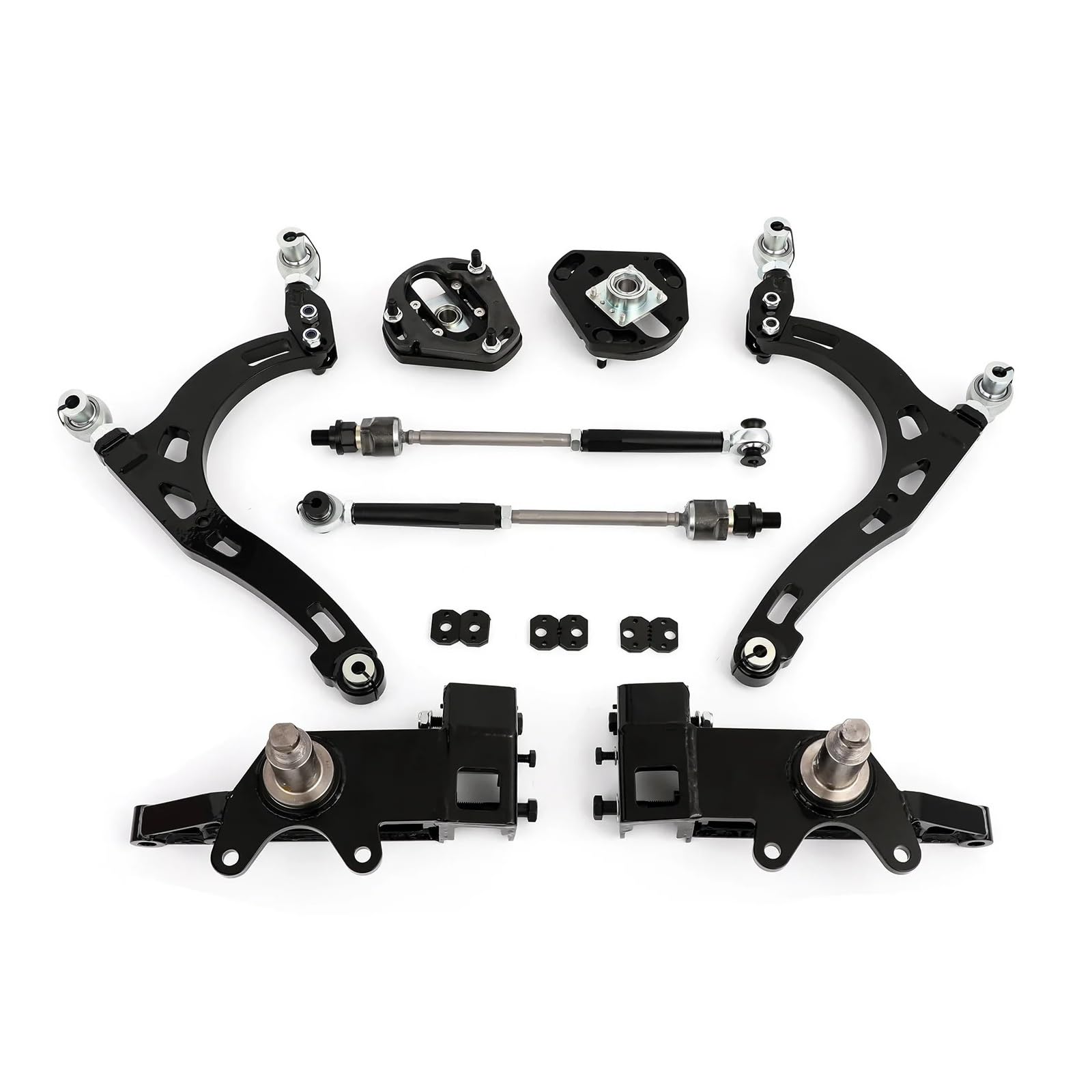 A pair of lower control arms with bushings and ball joints for stable and quiet ride quality.