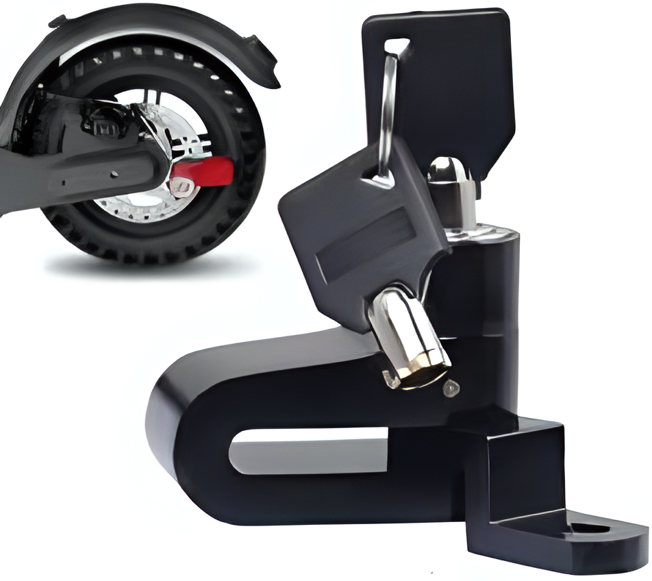 Hardened steel lock preventing wheel rotation.