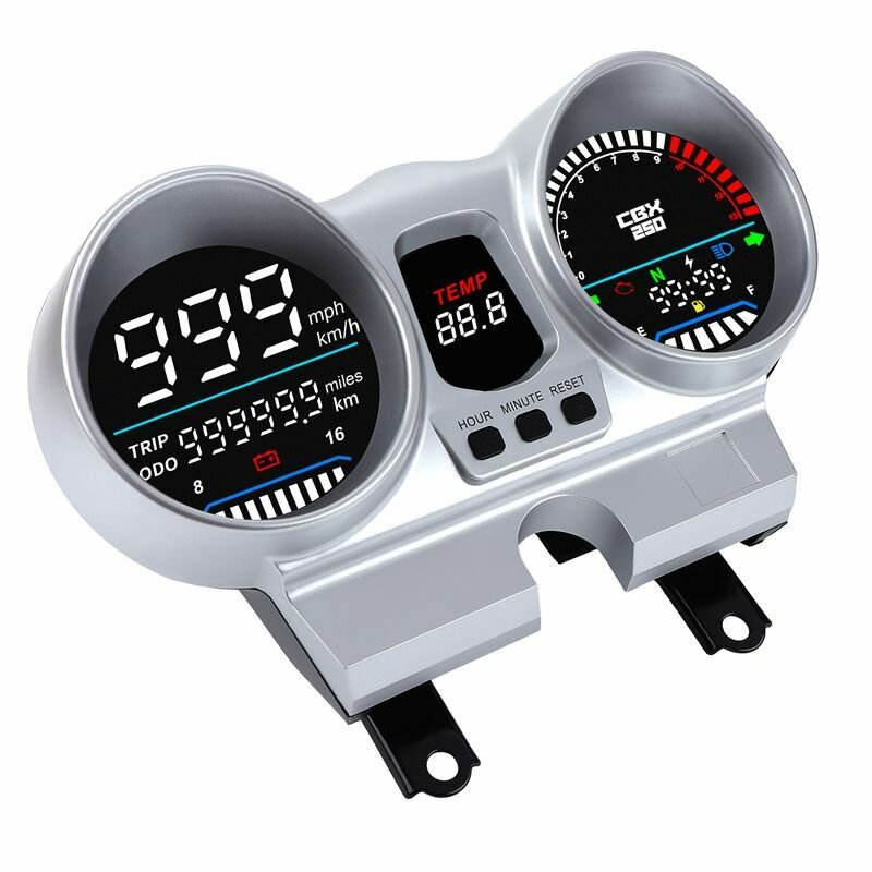 A modern fully digital replacement for older instrument clusters displaying speed RPM and gear position.